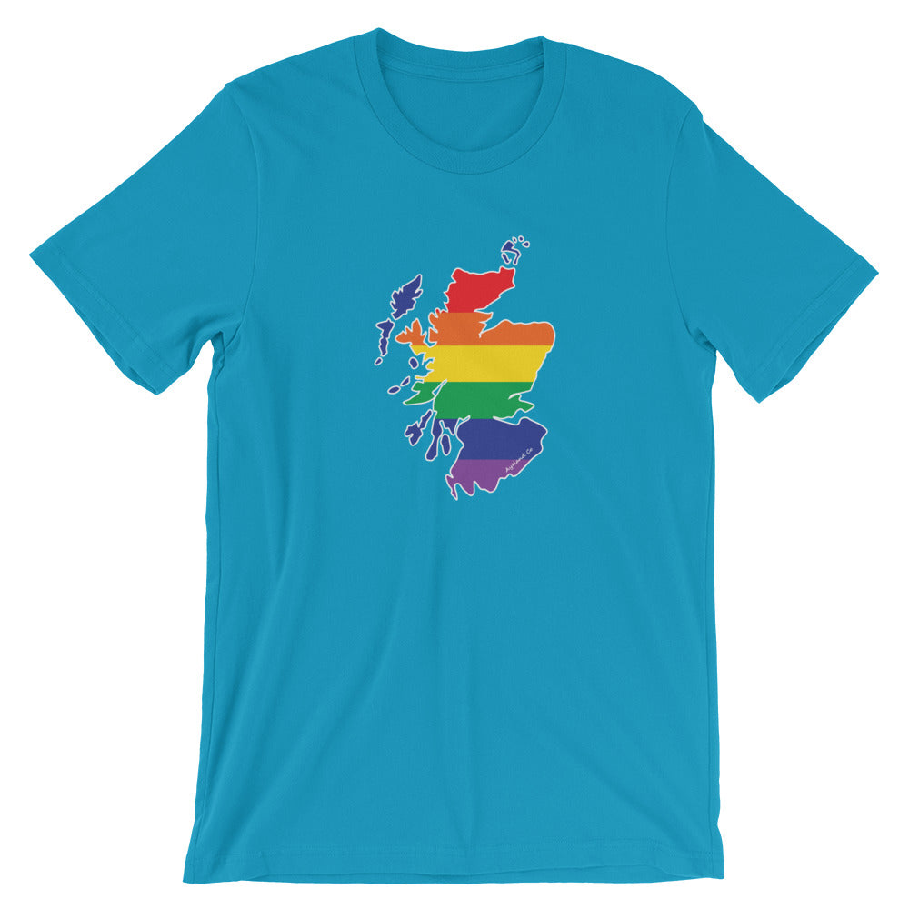 This map of Scotland with the rainbow flag in it is perfect to wear at a gay pride parade